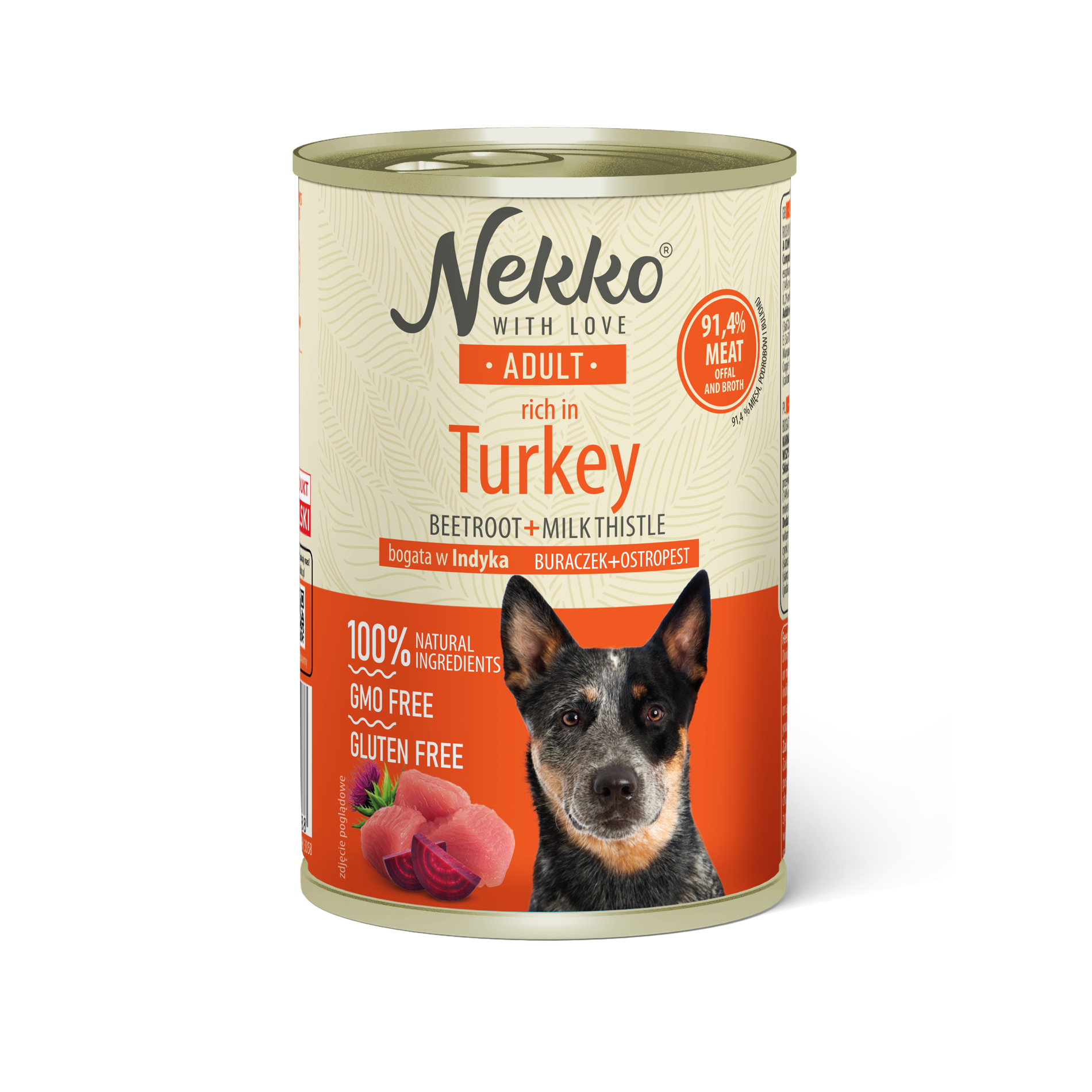 Nekko is a complete wet food for adult dogs of all breeds, distinguished by its 100% natural ingredients and exceptional palatability. The food is free from GMOs and gluten.