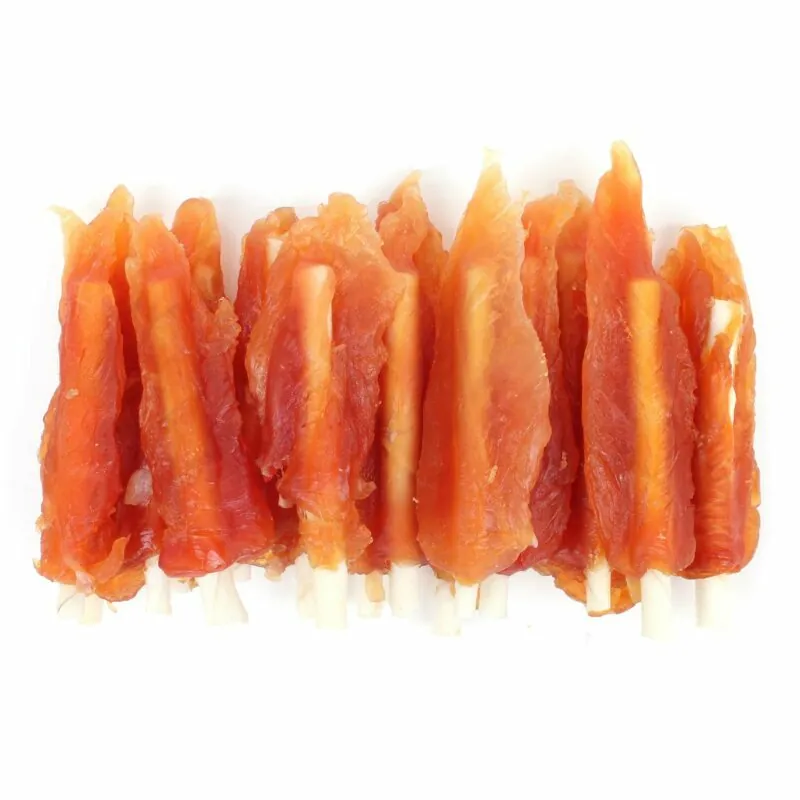Soft chicken jerky and white twists. Complementary feed for dogs.